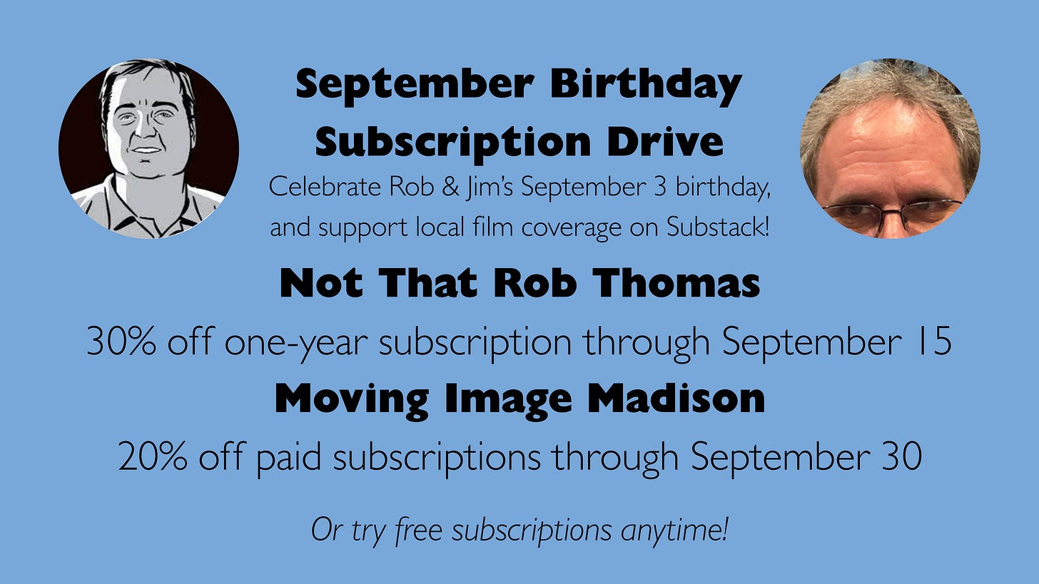 It’s my birthday on Wednesday, September 3. It’s Rob Thomas’s birthday, too! Help us celebrate by subscribing to our Substack newsletters, both of which discuss films and film culture in Madison.