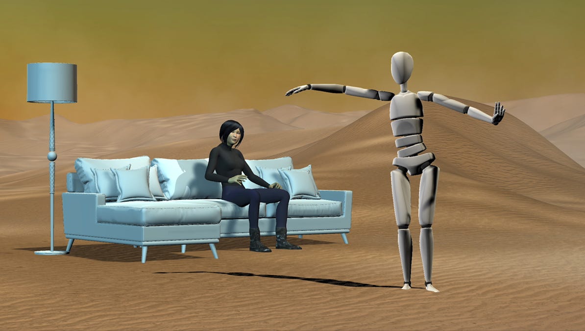 Different kinds of “statues” (or embodiments, or frameworks) appear in other recent films in the program, as a means to explore the impact of video game engines, motion capture, artificial intelligence and augmented reality. In Moving or Being Moved (2021), quotes from post-modern dance theory provide an interesting context for images generated by a woman (Gruffat) who is wearing a motion capture suit while vacuuming a living room. Souvenir Statuette (2024) explores the definition of a “souvenir” when, as Gruffat states in her program notes, “some of the quasi-objects in this video were once objects, others are non-objects or computer model imaginaries.”