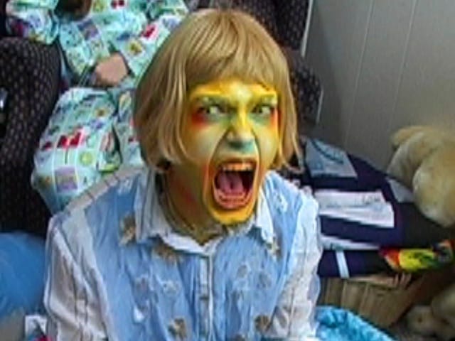 Trecartin also plays Pasta, a media consultant with grotesque makeup and yellow eyes. We first meet Pasta when he was a child named Jengo, who is abandoned by his mother Karen in a bead store. Jengo grows up, changes his name to Pasta, and starts a mixed media business with his partner, Wendy. Pasta and Wendy consult two young girls on a proposed music video, and promise to showcase their lives, only better, with edits.